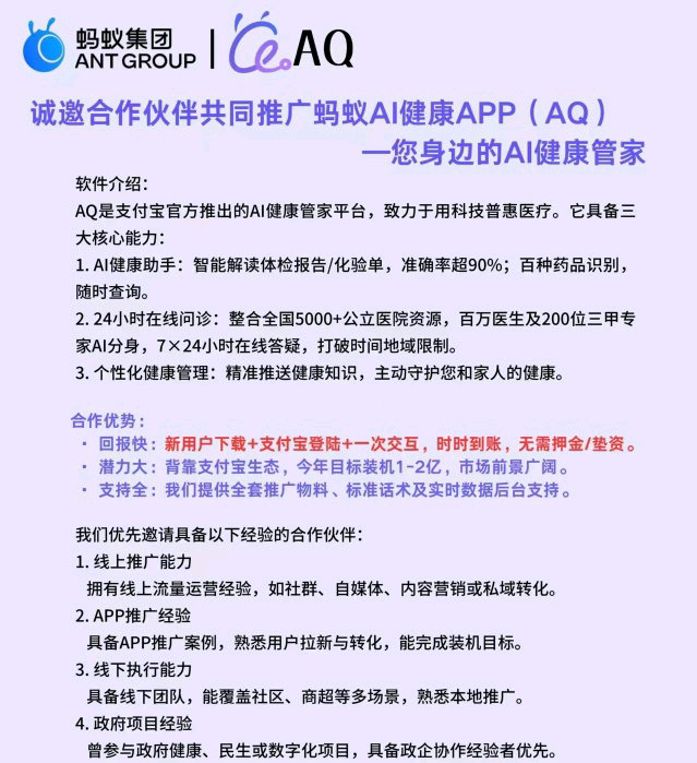 合作优势: ·回报快:新用户下载+支付宝登陆+一次交互,时时到账,无需押金/垫资。单价:5~10+,实时数据,日结 ·潜力大:背靠支付宝生态,今年目标装机1-2亿,市场前景广阔。 ·支持全:我们提供全套推广物料、标准话术及实时数据后台支持。