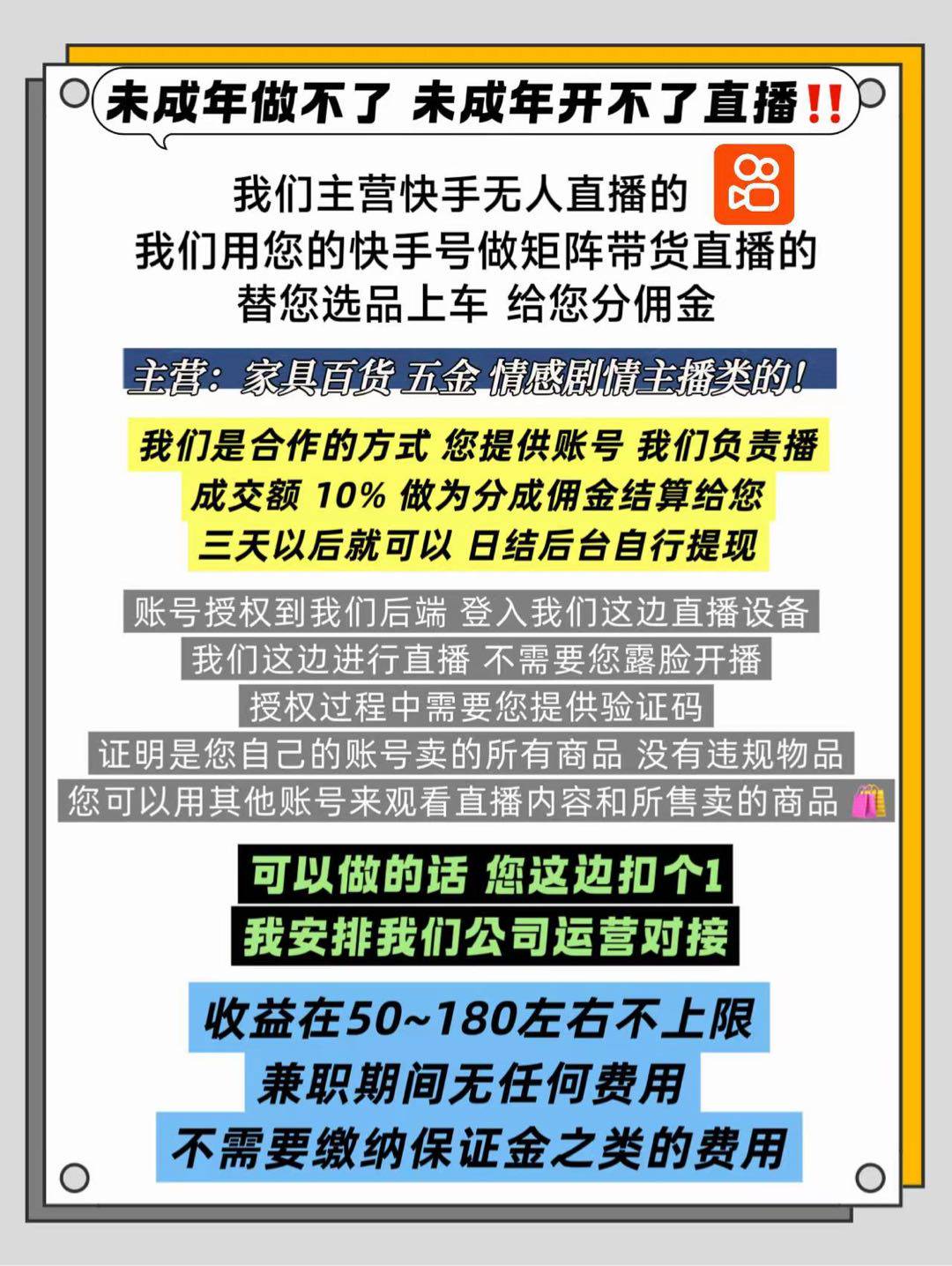 快手直播带货(不用本人直播) 名额有限先到先得 快手无人直播带货,您提供快手账号,授权过来就行 带货品类:家居百货五金(你手机端可以实时查看 直播内容和带货品类) 结算:3天一周期 保底50-180元另有直播成交金额10%的提成