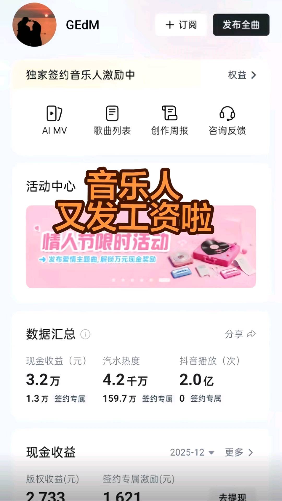 AI音乐制作发行 独立后台,不是合作,技术服务费299,白嫖勿扰。马无夜草不肥,人要有被动收入才可抗风险,有空多写歌,有空就花几分钟用AI写歌,在平台上发布,有流量就有收益,平时不用管,需要钱的时候走上去看看,无脑式操作,简单靠谱。