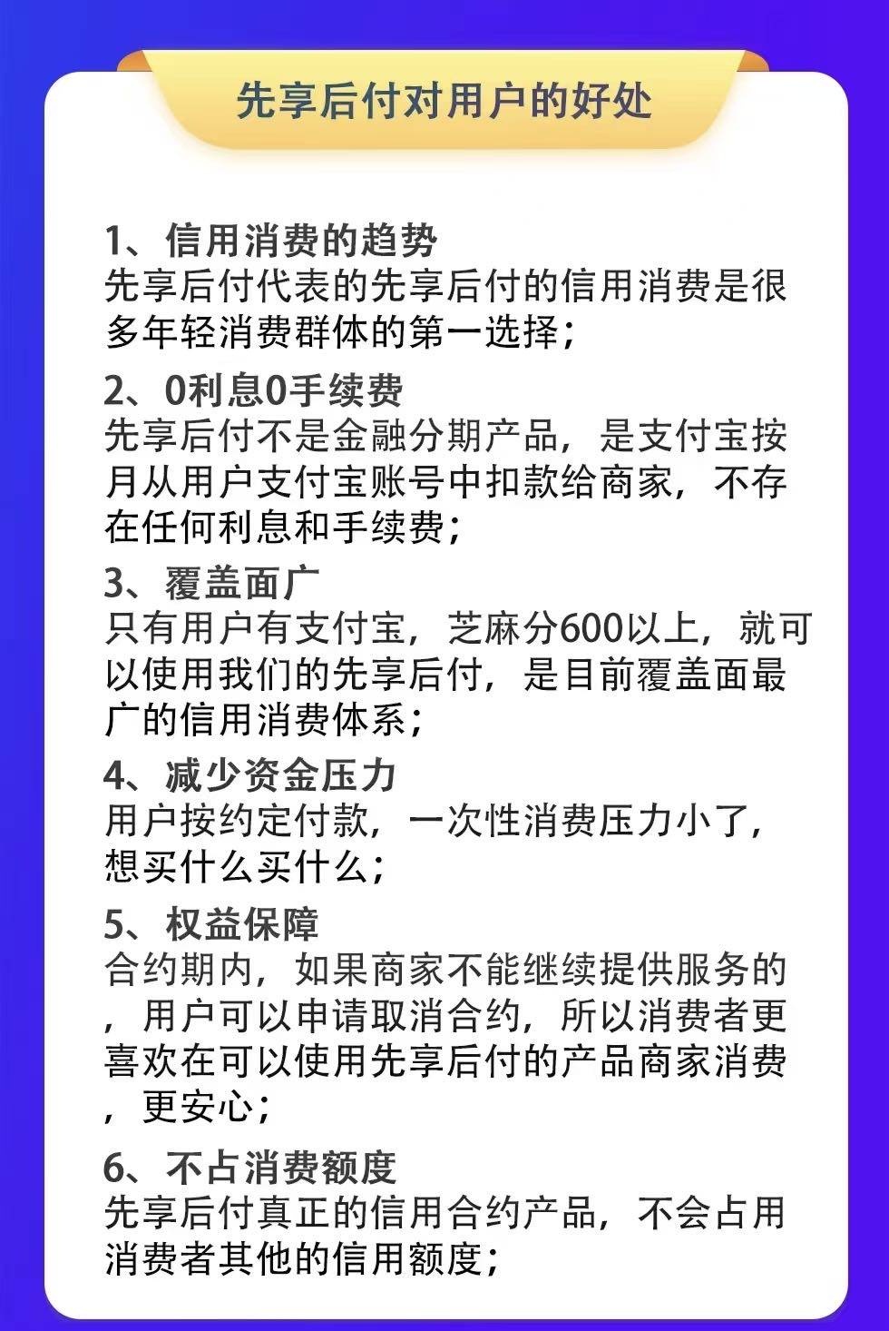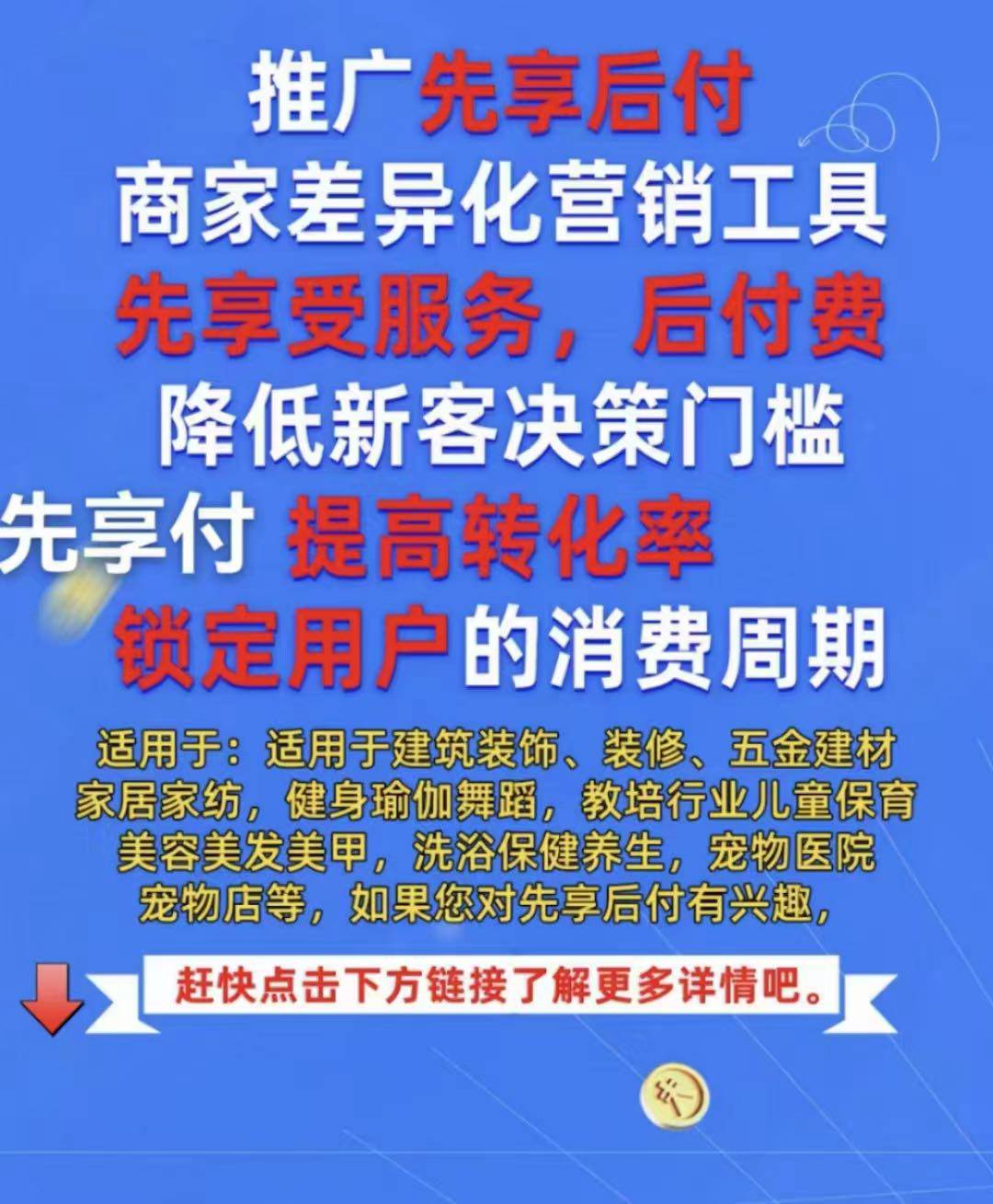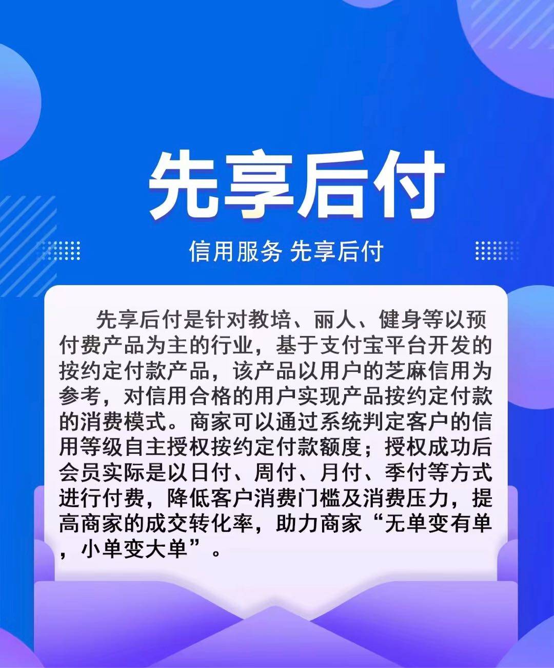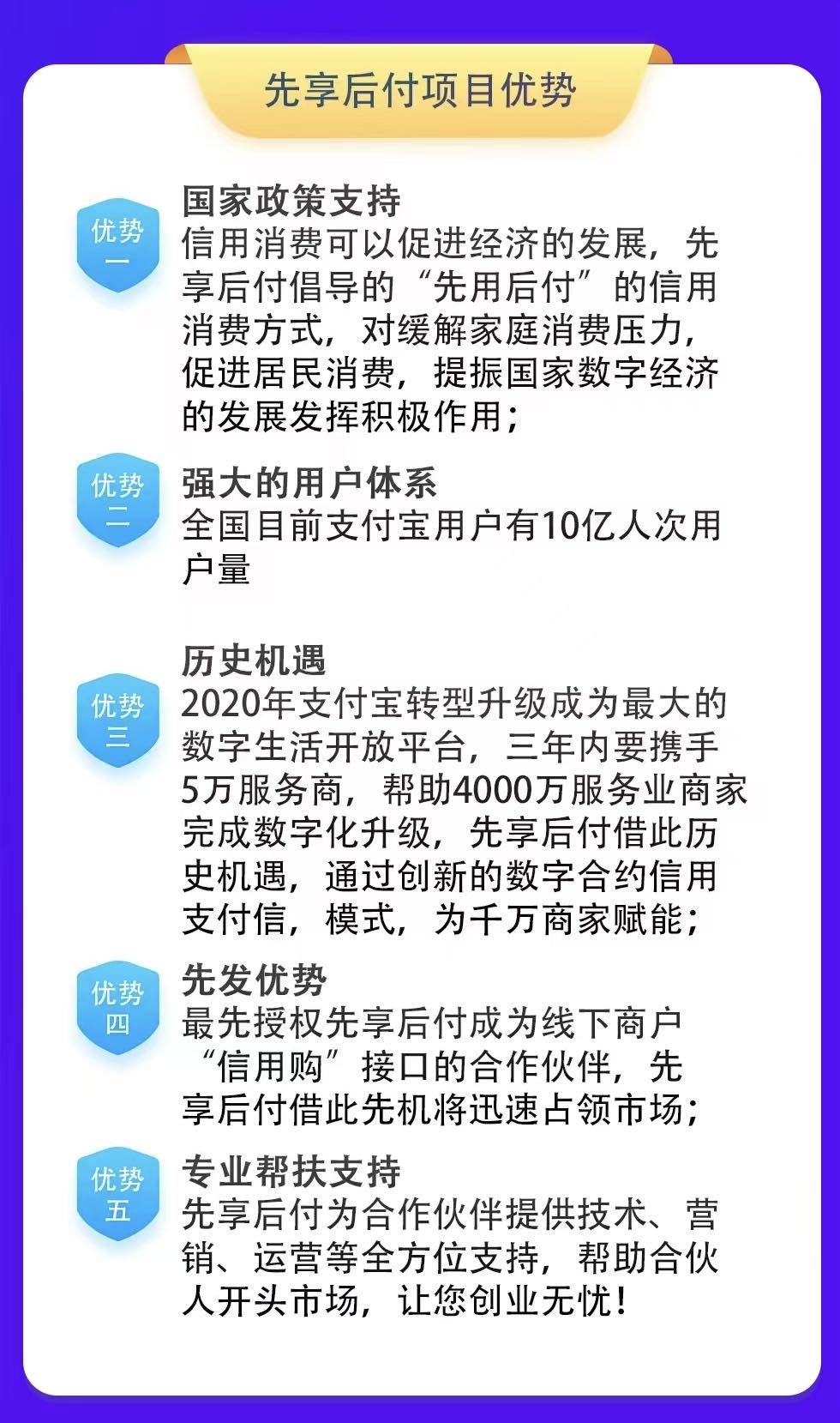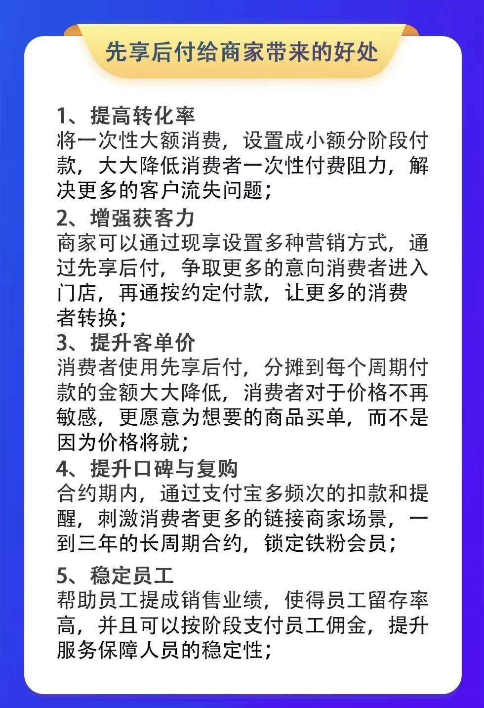 项目 线下版的“0元下单,分期付款”。 比如美容院5000元会员卡,顾客担心商家跑路或一次性拿不出钱。扫聚合码(支持微信、支付宝、银联、京东),就能把5000元分10期,每月自动扣款。(期数和金额商家可根据实际情况设置) 既降低了消费者消费决策门槛和商家信任问题又能为商家实现