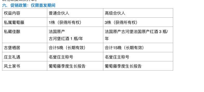 (1) 普通事业合伙人: 投入99万元 获得合伙人权益(合作期5年);获赠30张至尊卡项;获赠价值200万元产品礼包 带客消费额流水分成12%(可按照消费额的25%转换为健康项目金) (2)高级事业合伙人:投入198万元 获得合伙人权益(合作期5年);获赠120张至尊卡项